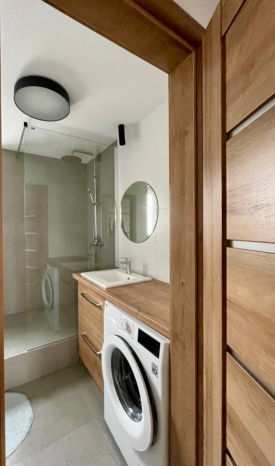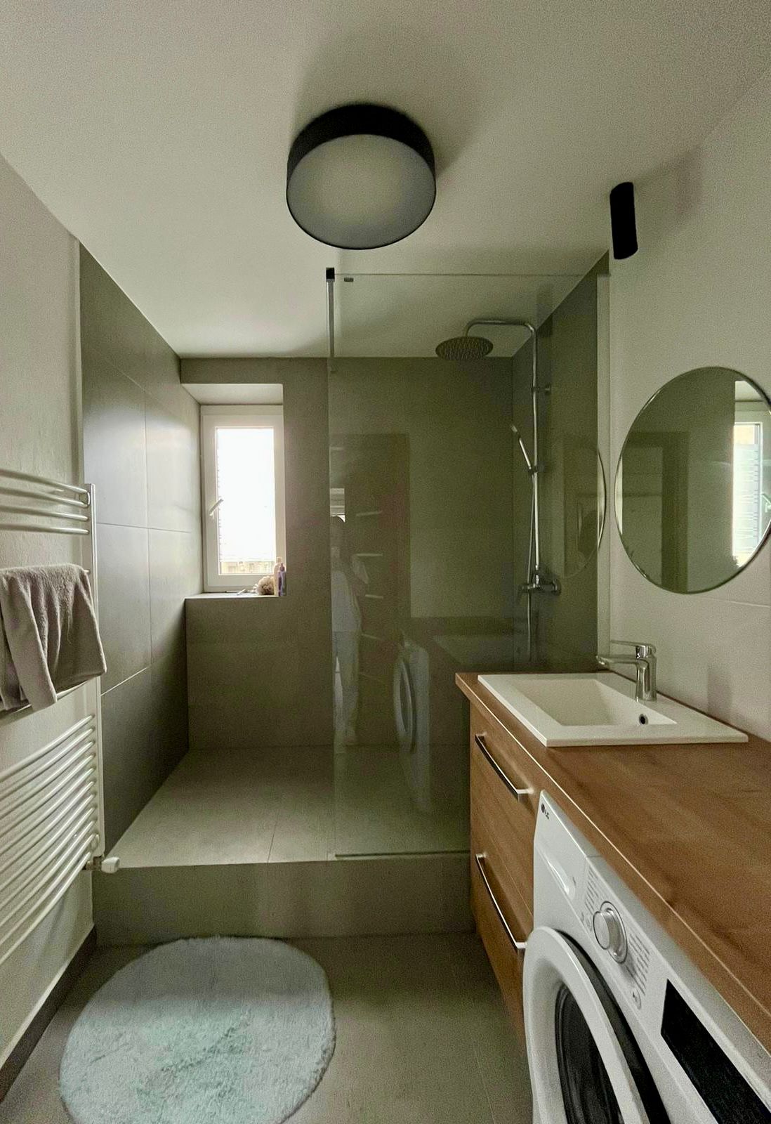 • kúpeľňa s moderným sprchovým kútom, sanitou a automatickou práčkou